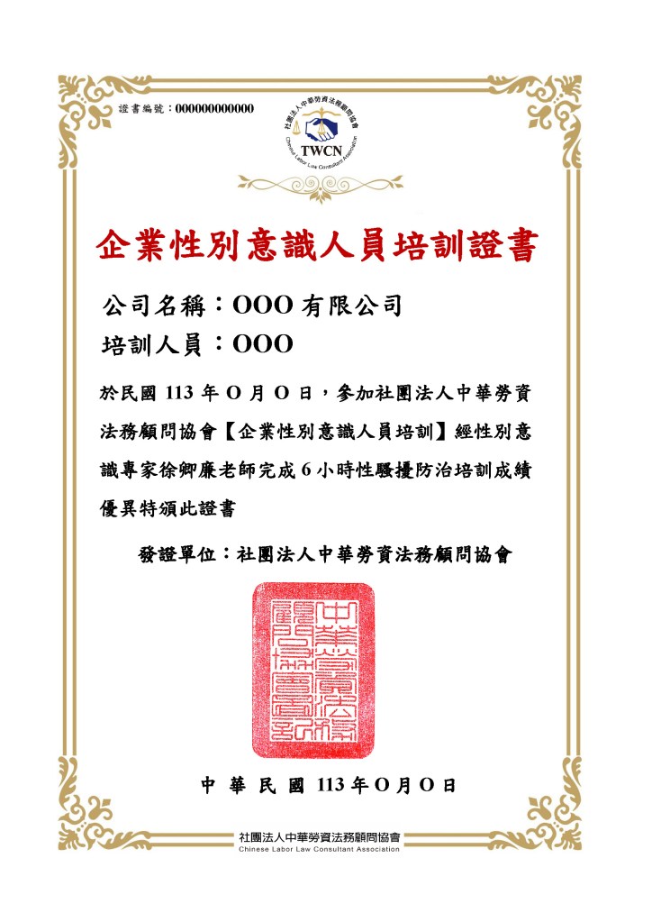 培訓完成可取得中華民國全國工業總會舉辦的LLA勞動法務能力鑑定考證資格。(需自付餐費及講義費400元)