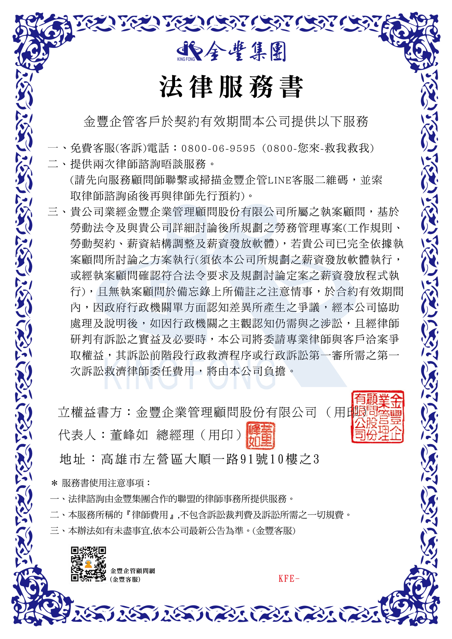 - 請持「金豐集團-法律諮詢委託函」,於七個工作天內請主動聯繫法律諮詢窗口,並自行約定見面方式與時間地點。