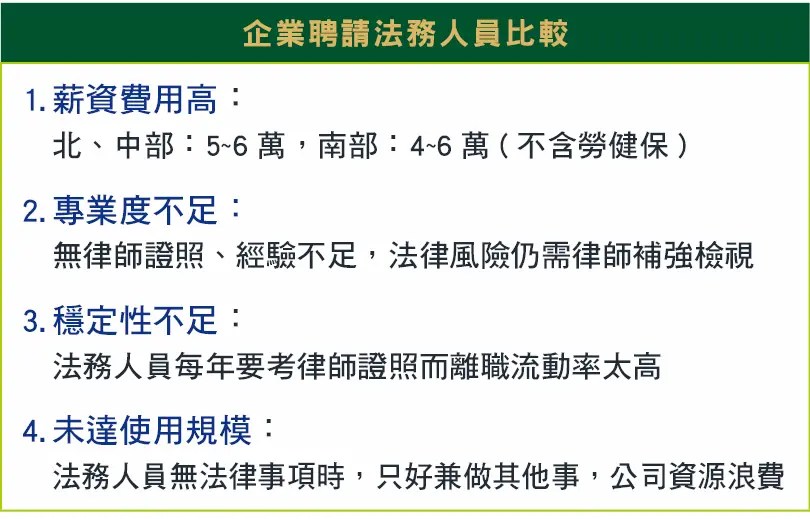 ㄧ般法律常年顧問,有諮詢時數限制,有文件次數限制,本服務可取代您目前法律常年顧問